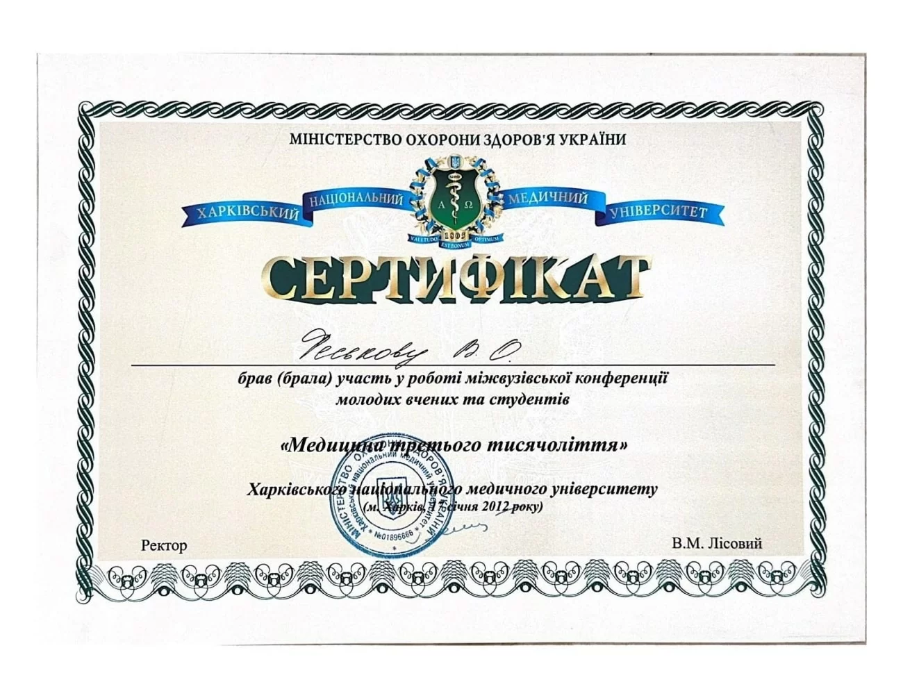 Certificato per il 2o posto alla conferenza interuniversitaria di giovani scienziati e studenti "Medicina del terzo millennio" dell'Università medica nazionale di Kharkov, sezione "Ostetricia e ginecologia"18 gennaio 2011, Kharkov, Ucraina